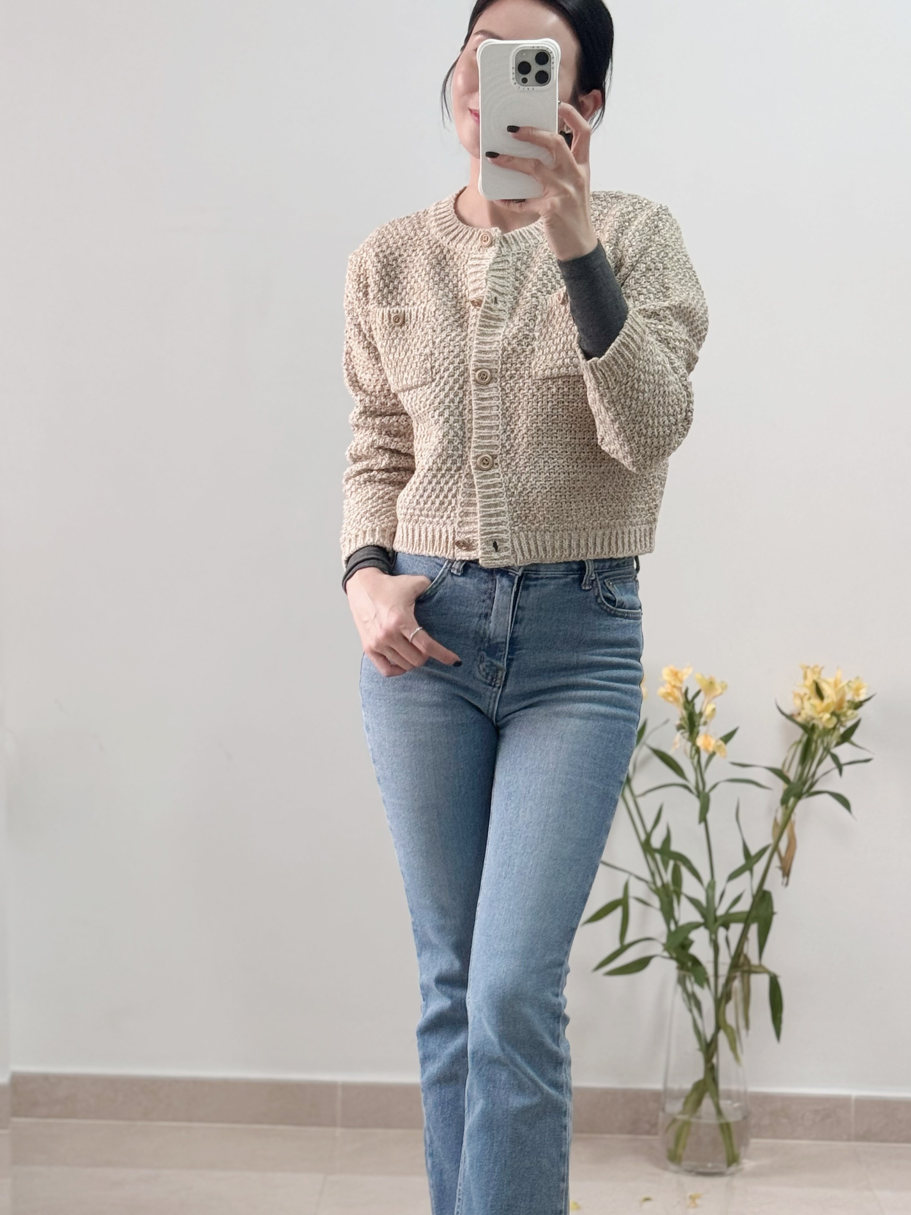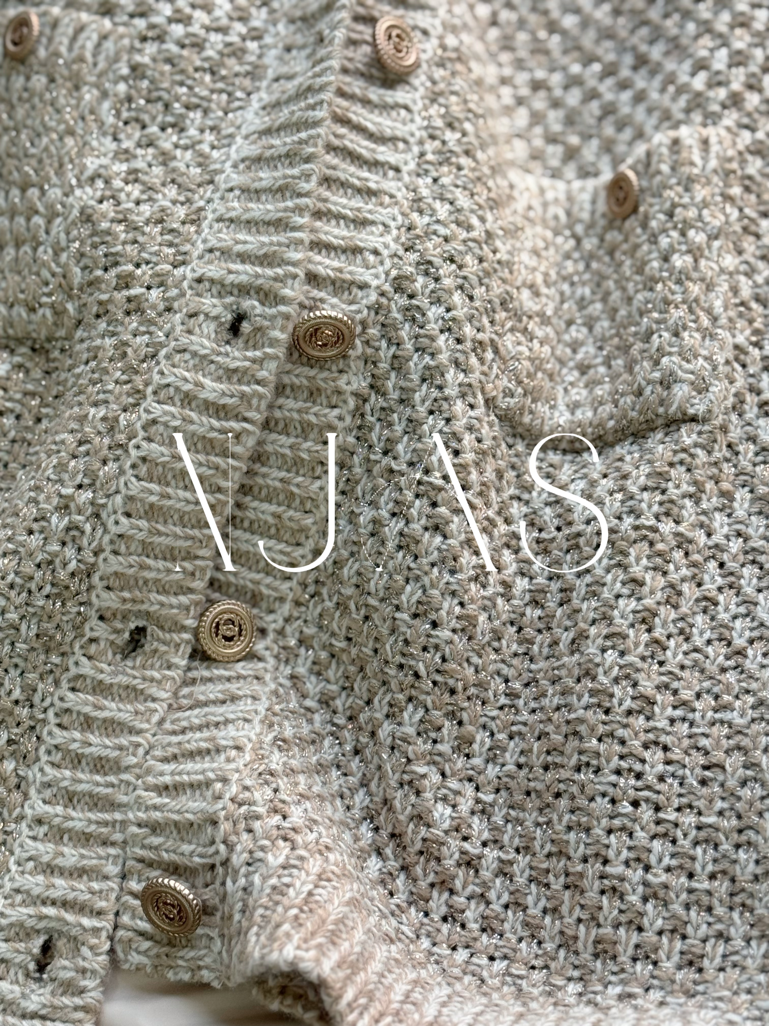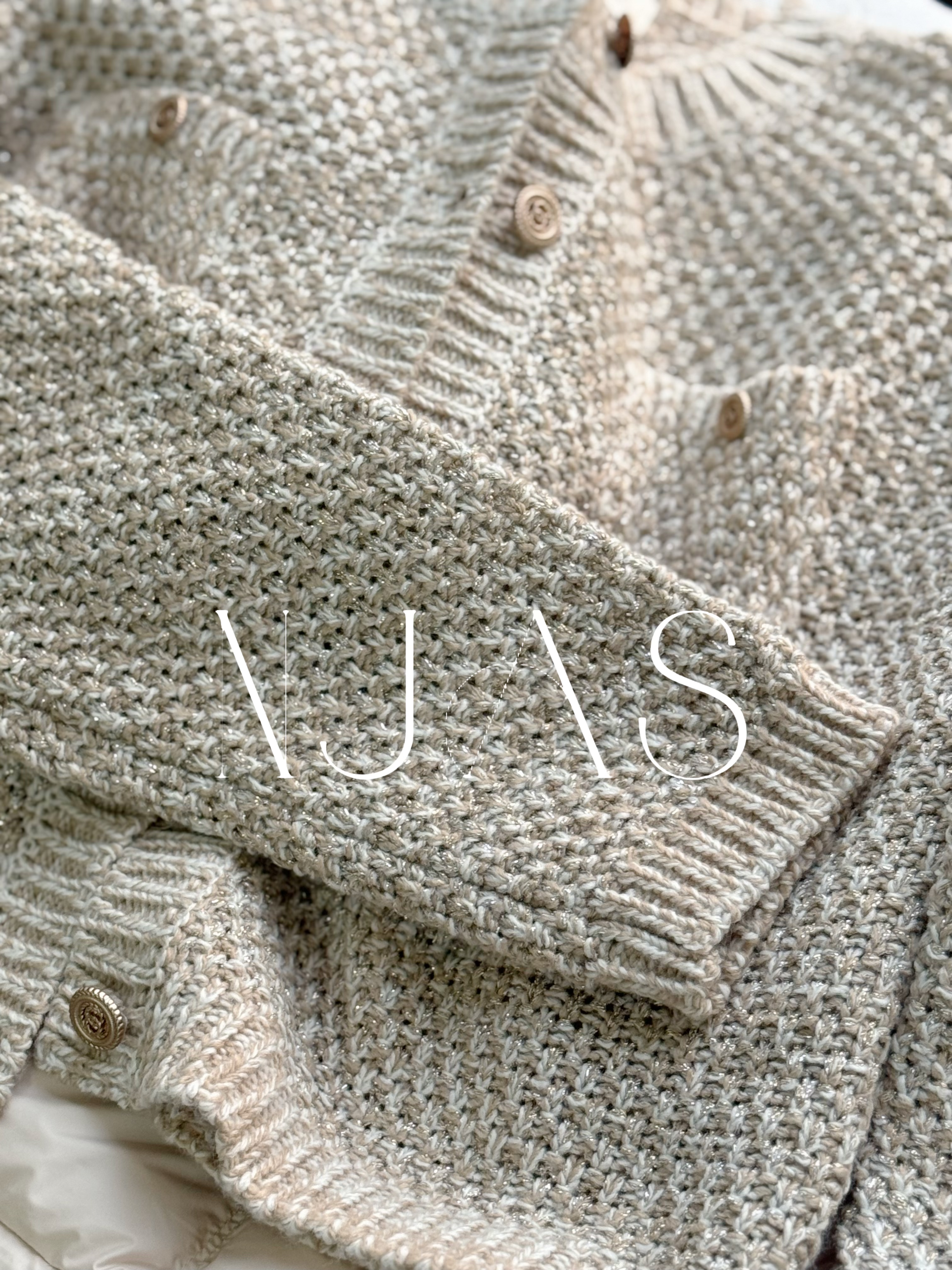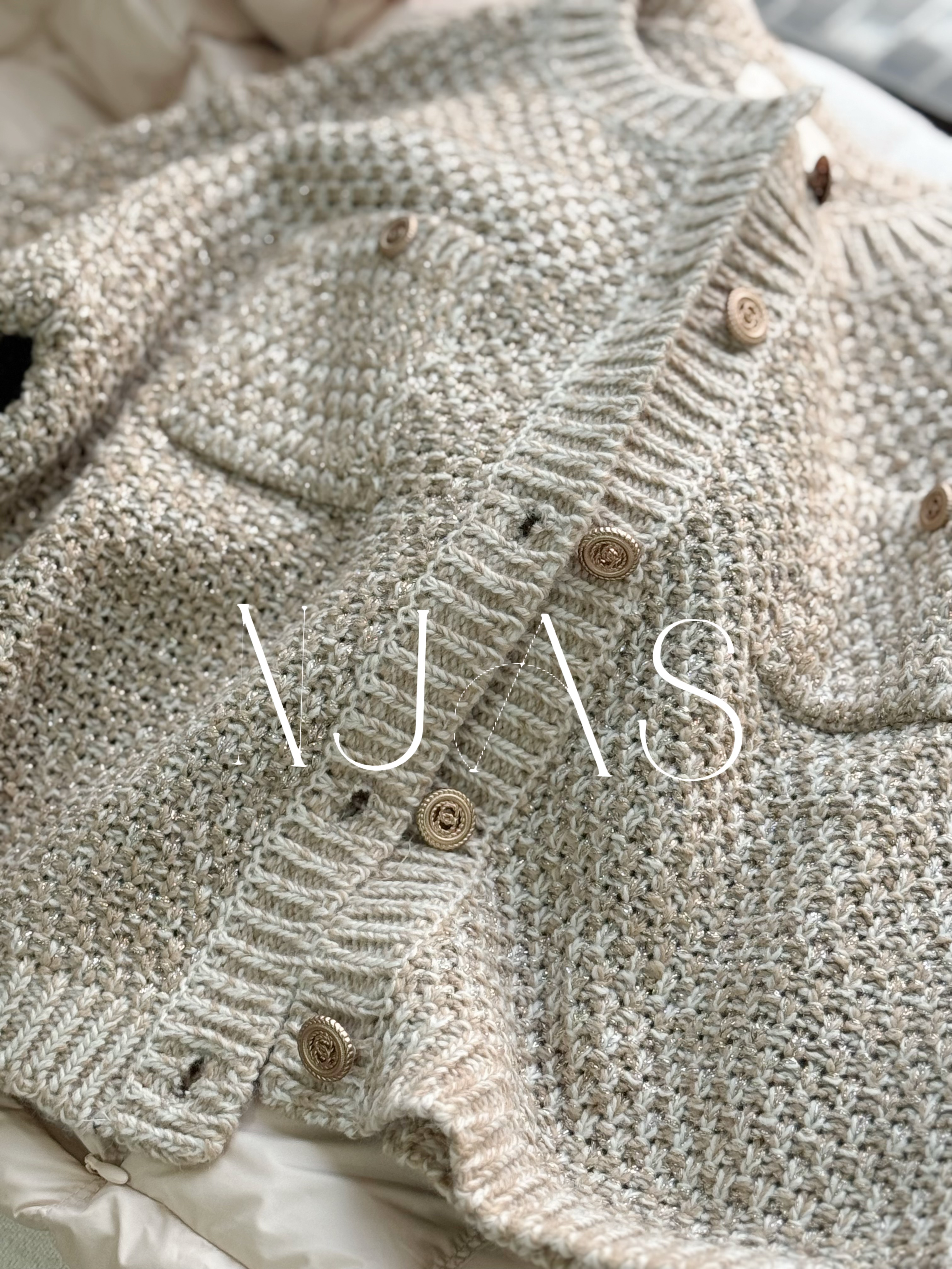 Acrylic poly wool Length 45.5cm (18”) Bust 51cm (40”胸圍) Shoulder 51cm (20”) Sleeve 60cm (23.5”) * 高質閃線混紡材質,隨着光線照亮有不同感覺,觸感堅挺有質感 * 經典款簡單俐落的設計,輕鬆搭配各種服裝 * 配上獨特而輕身金鈕扣