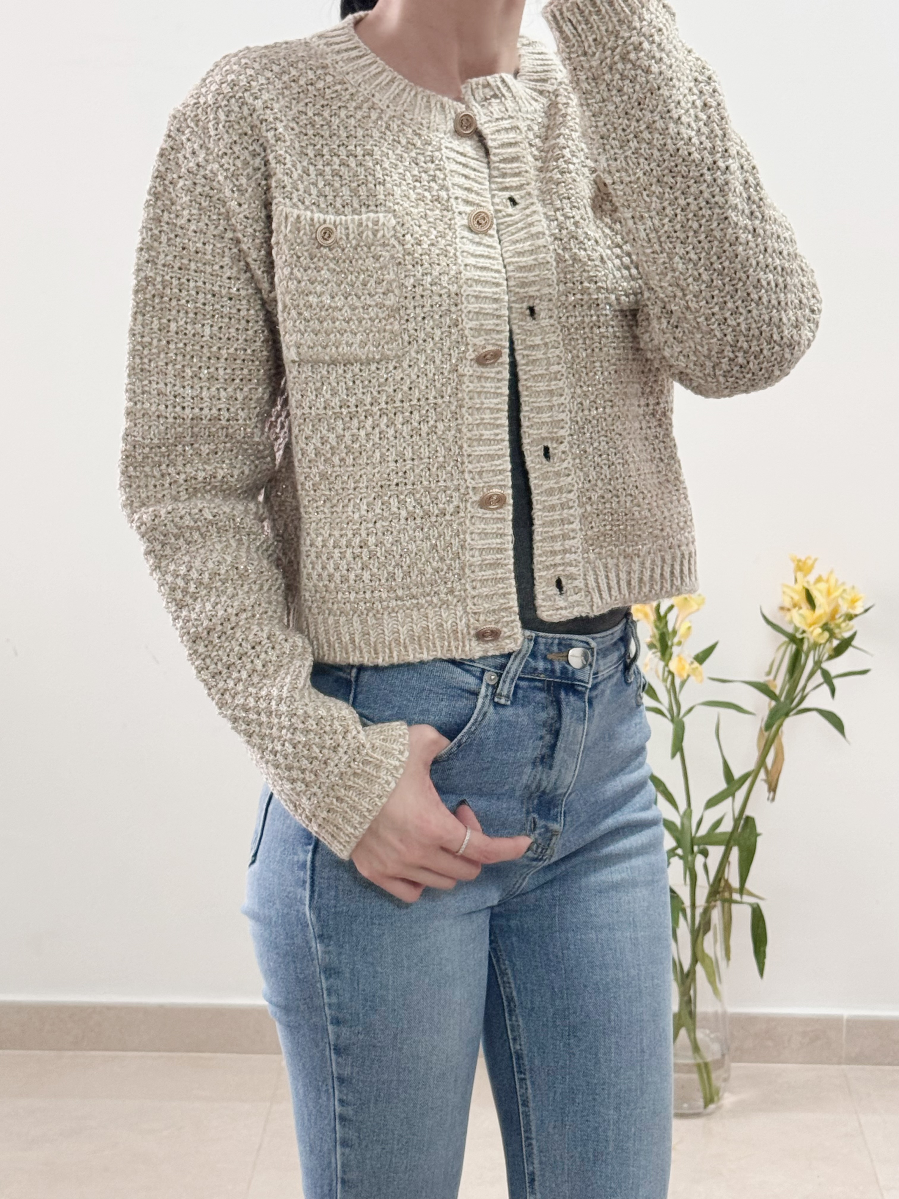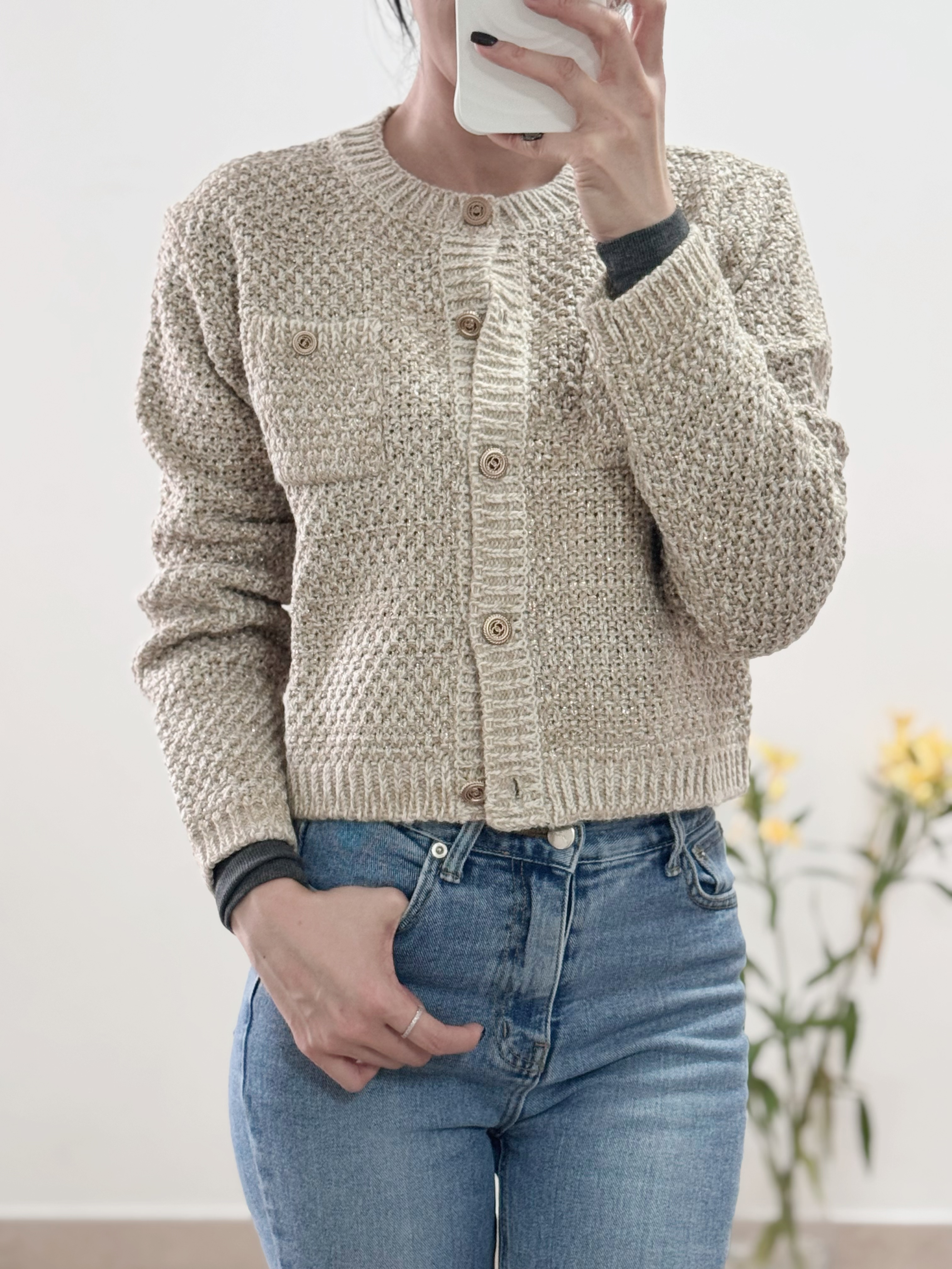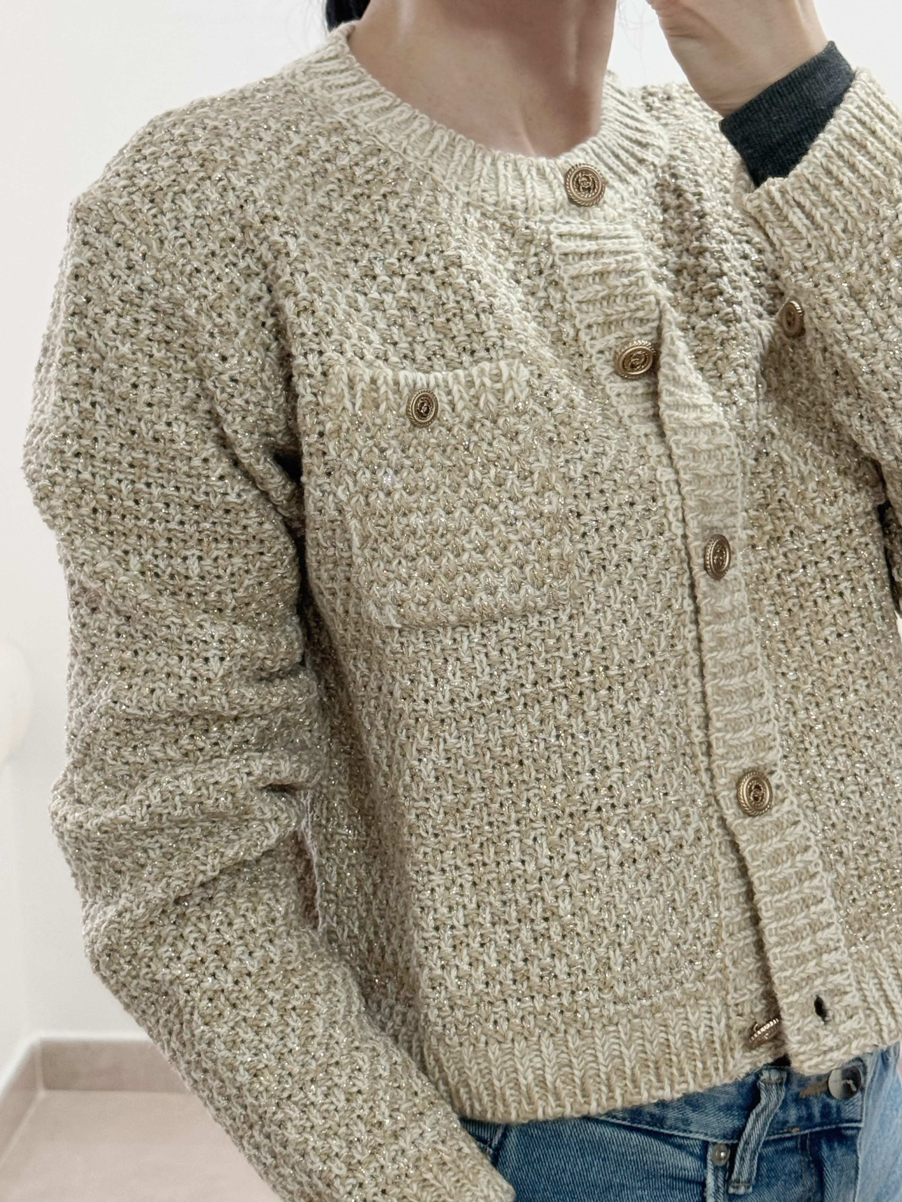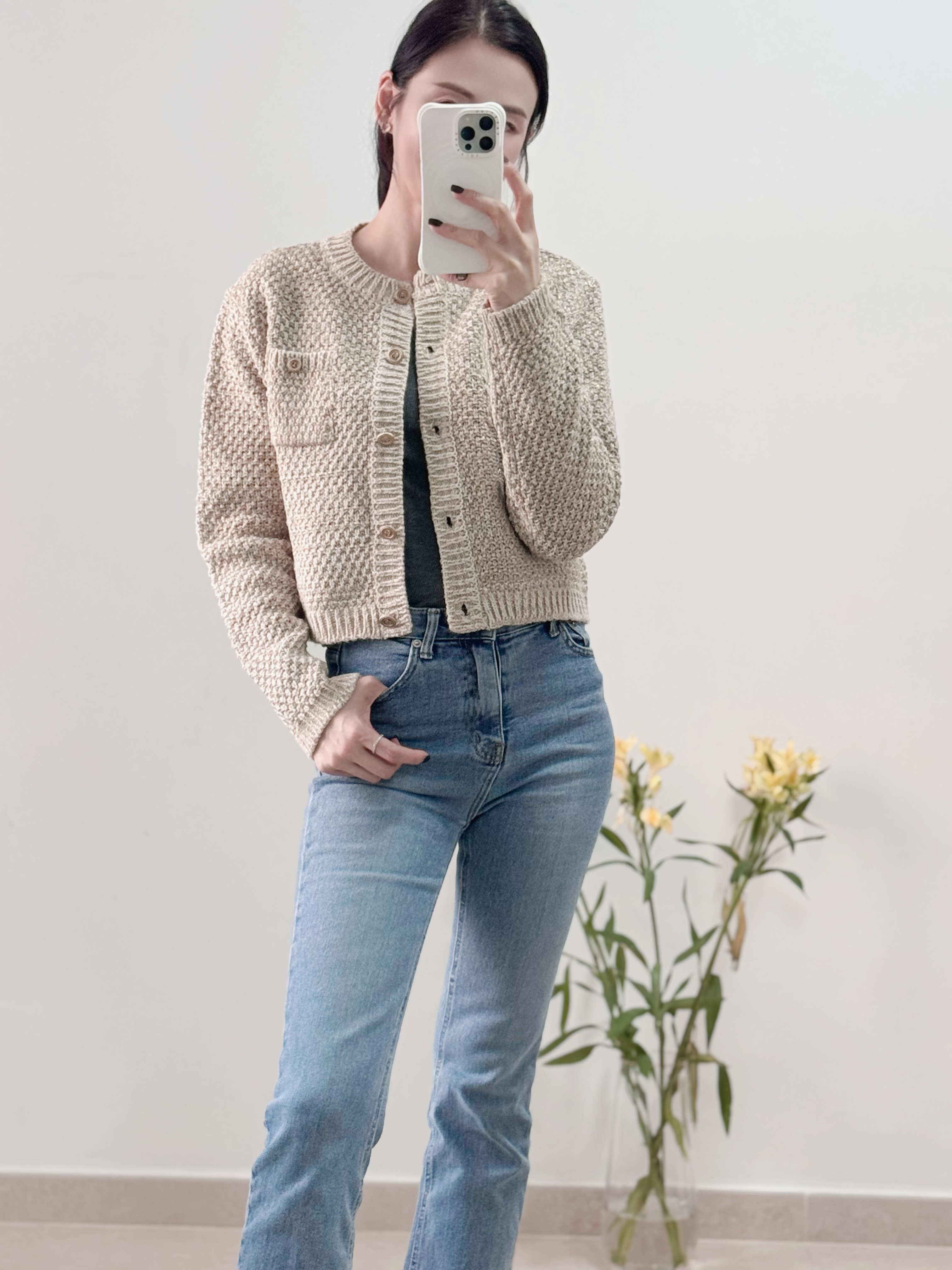 Acrylic poly wool Length 45.5cm (18”) Bust 51cm (40”胸圍) Shoulder 51cm (20”) Sleeve 60cm (23.5”) * 高質閃線混紡材質,隨着光線照亮有不同感覺,觸感堅挺有質感 * 經典款簡單俐落的設計,輕鬆搭配各種服裝 * 配上獨特而輕身金鈕扣