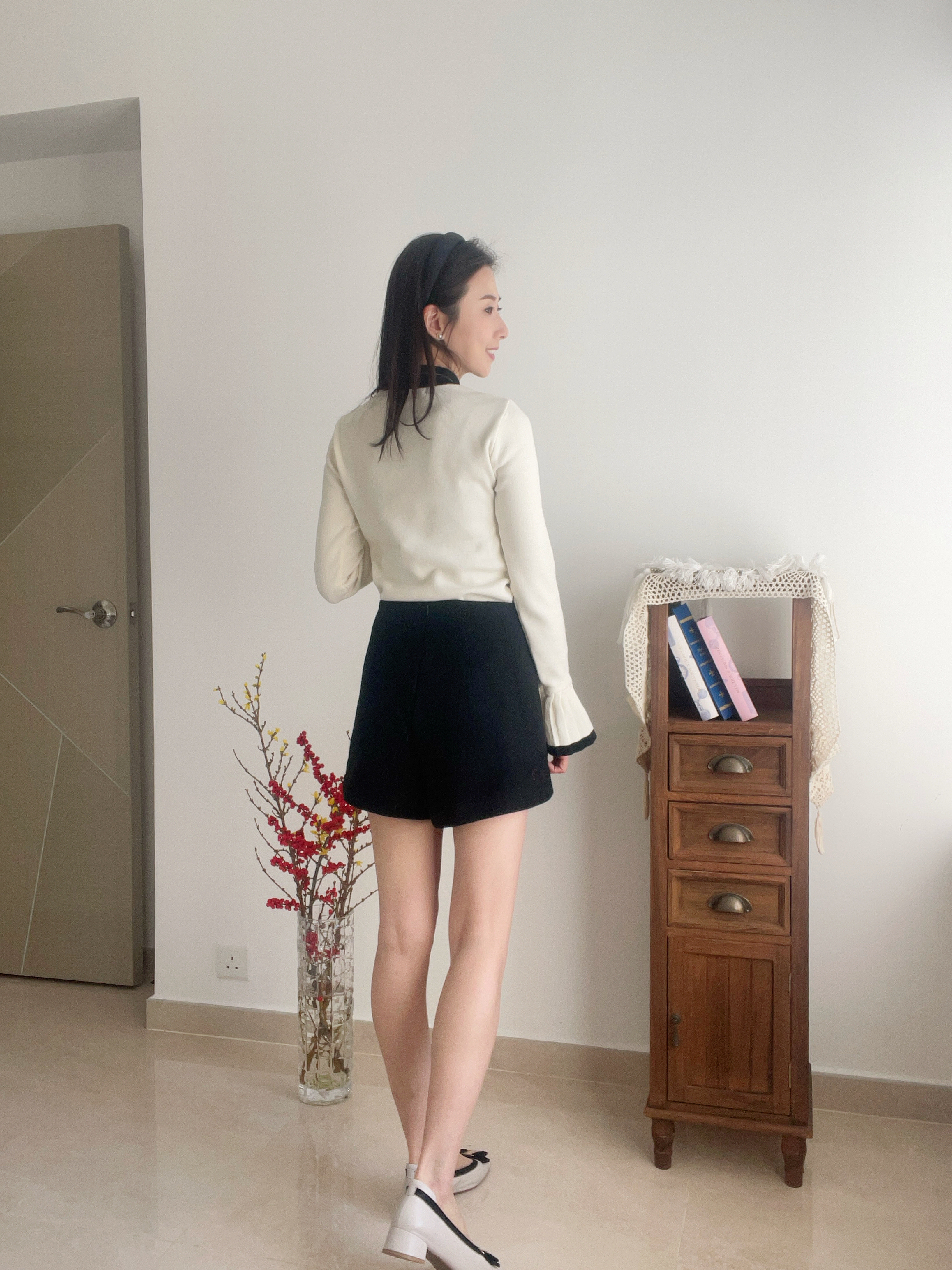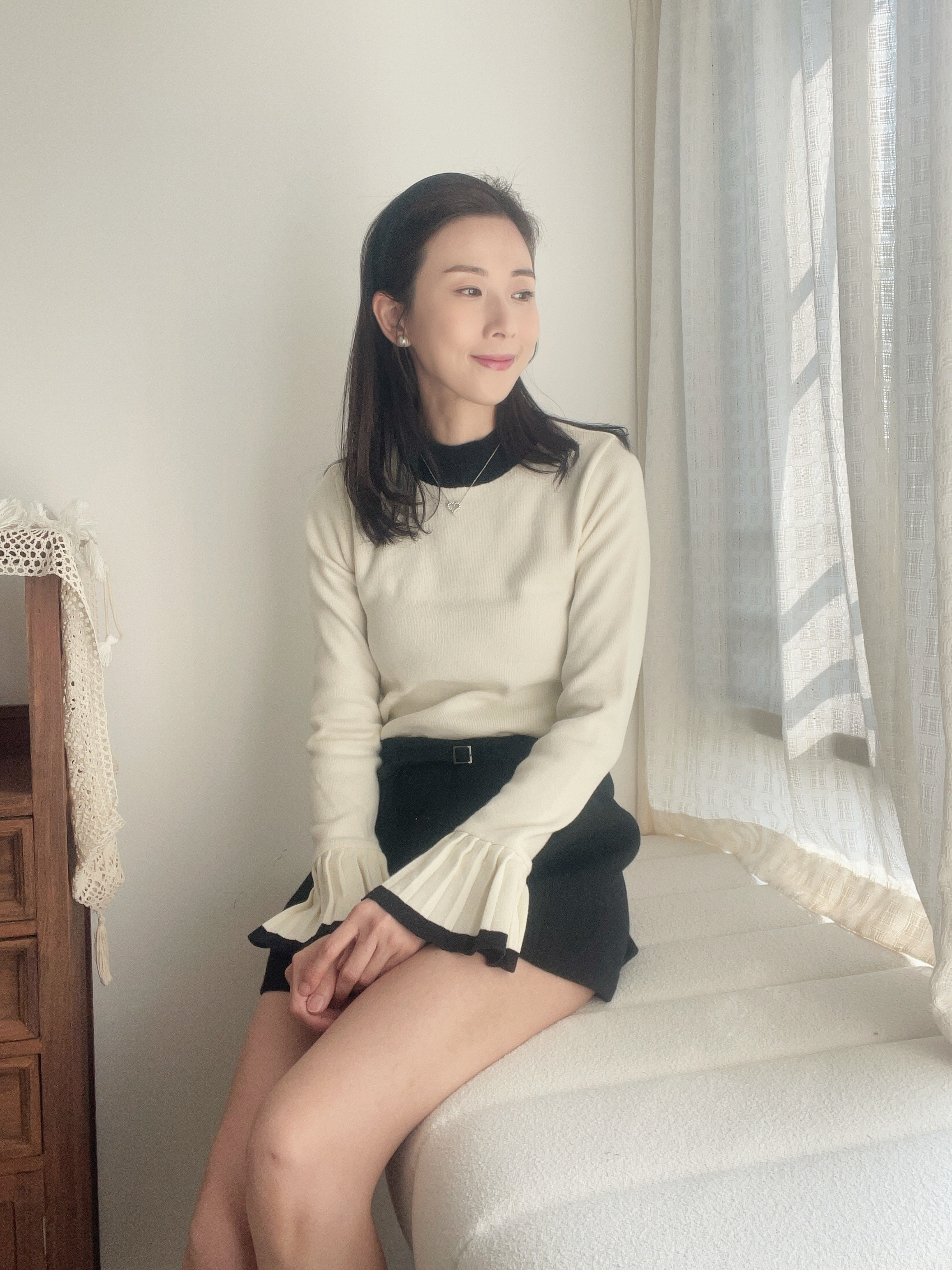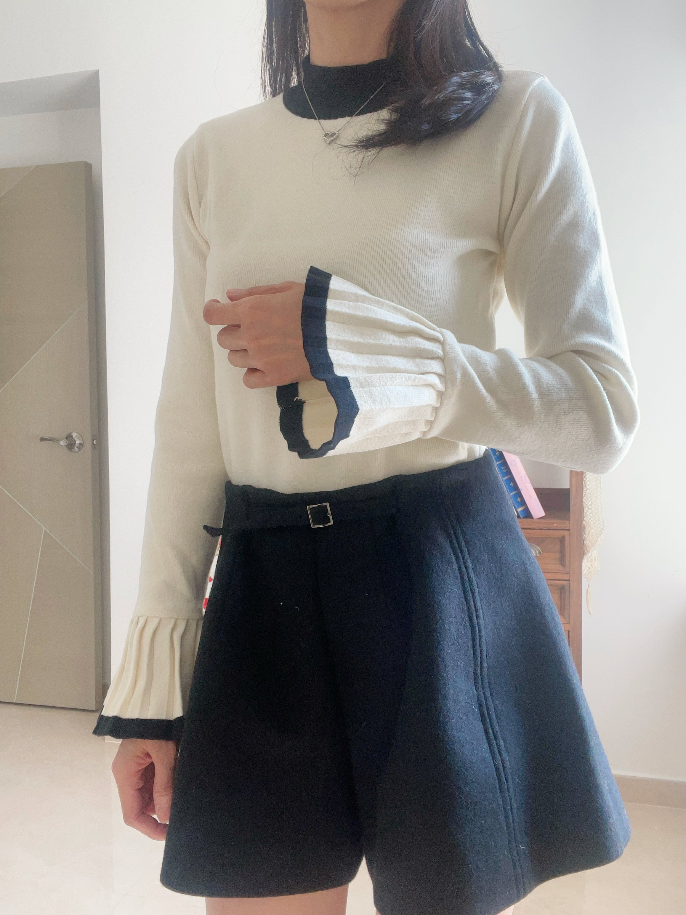 Retro flared pleat sleeve knit top Cream Ivory