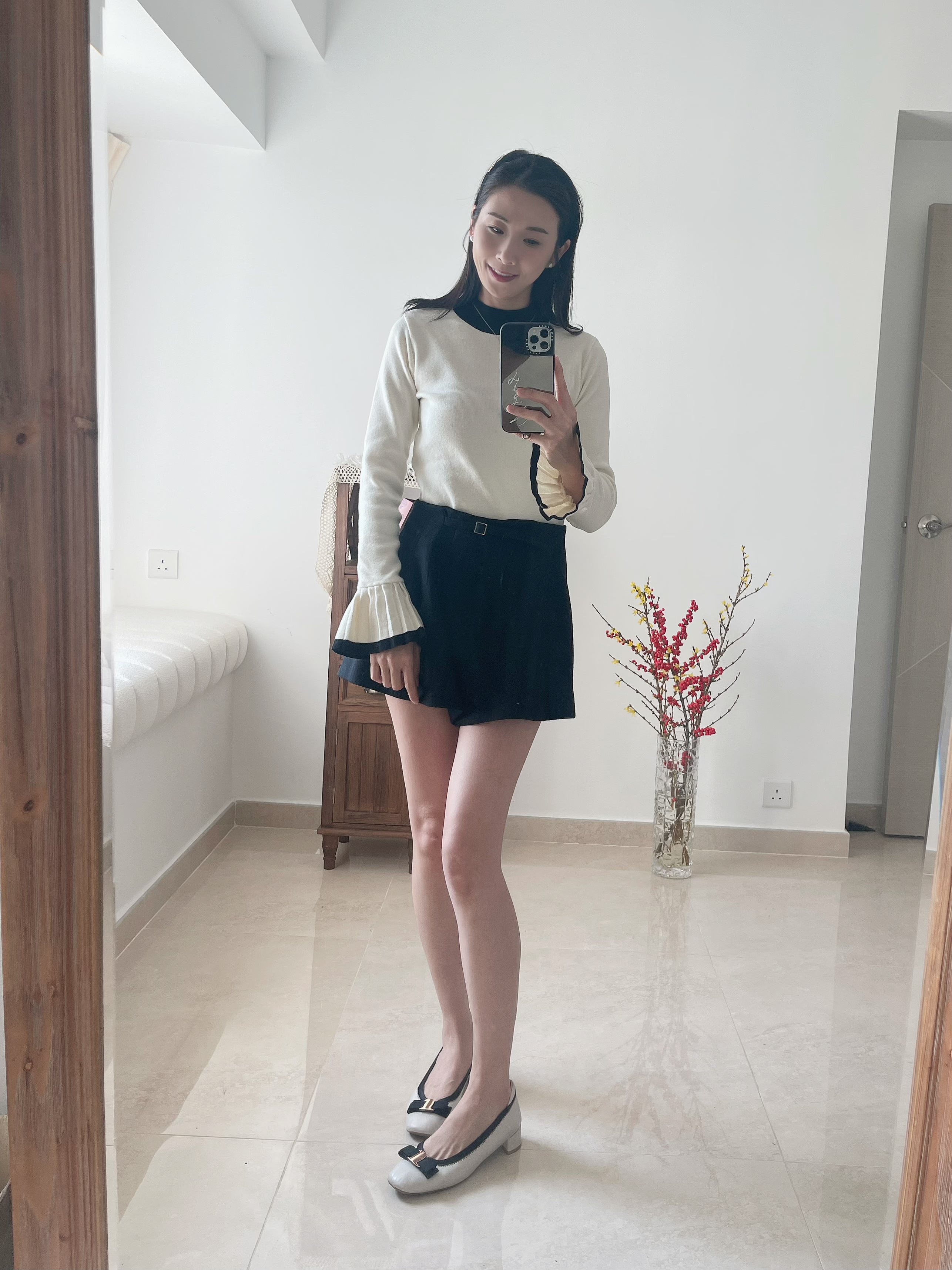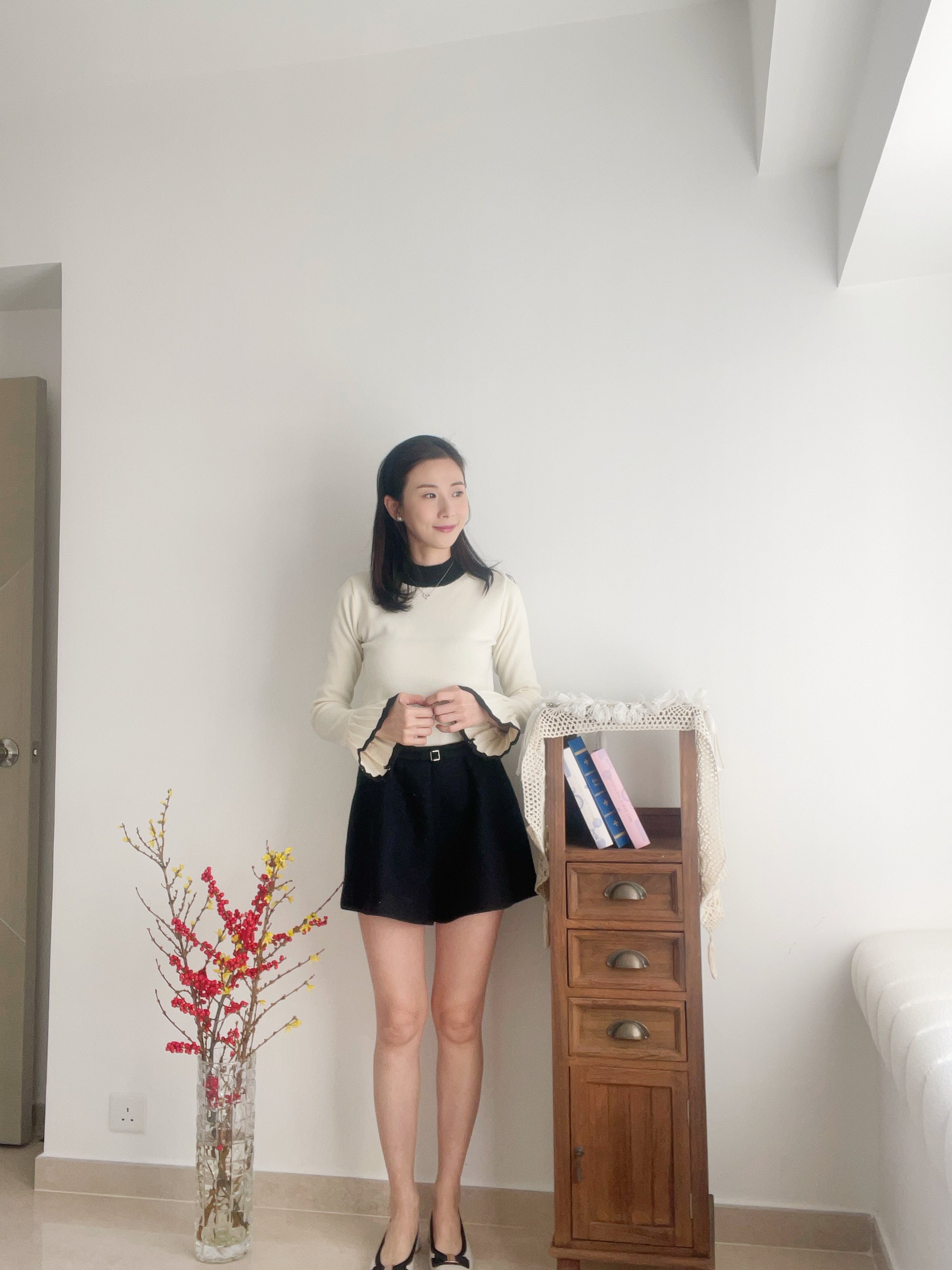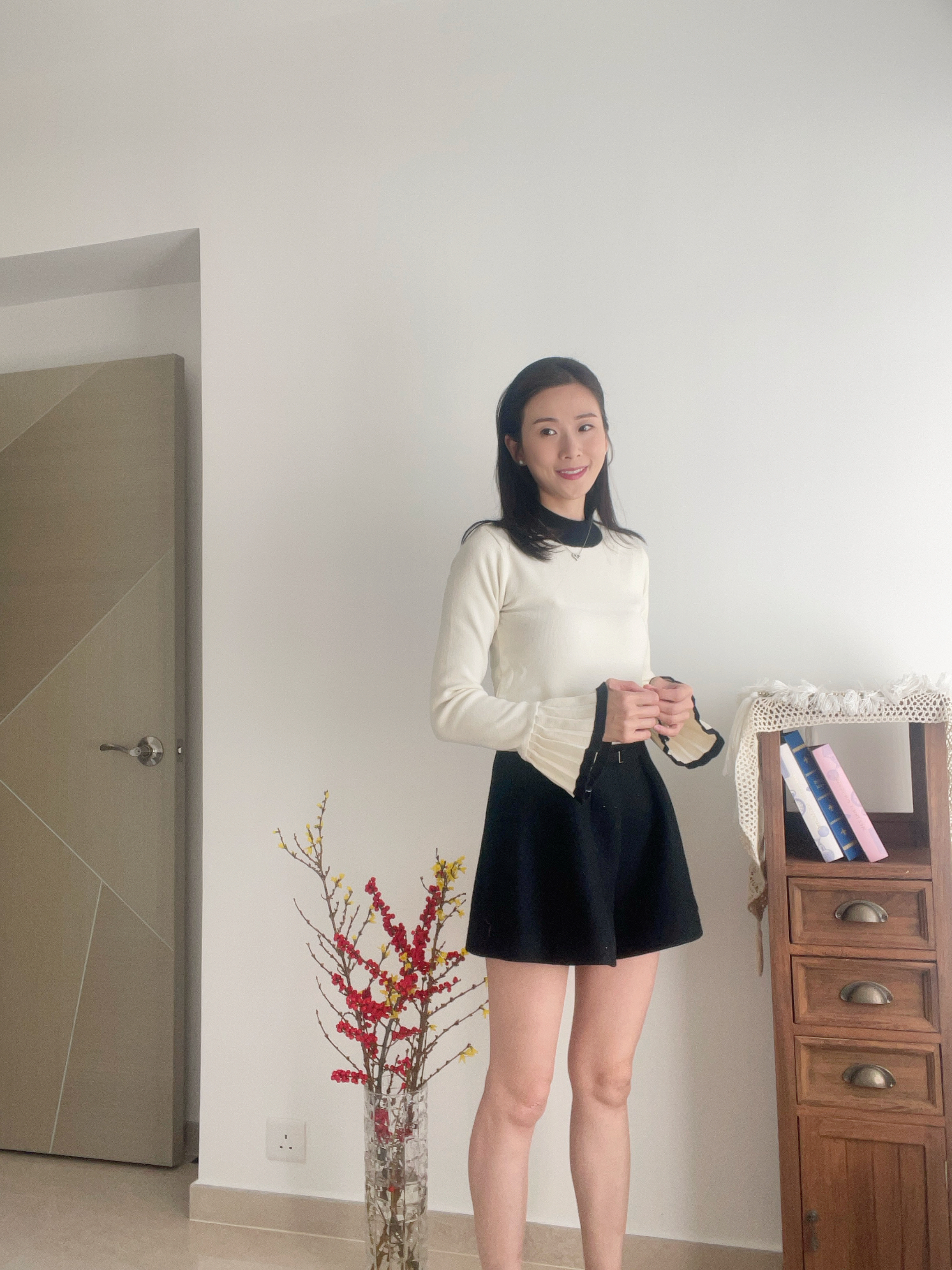 Retro flared pleat sleeve knit top Cream Ivory